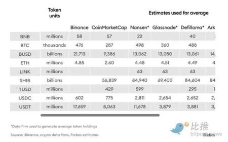 使用上述四家数据公司的以太坊 (ETH) 数据的平均值,福布斯估计 Binance 拥有 449 万个 ETH 代币,相当于 54.98 亿美元。相反,CoinMarketCap 的 33 亿美元估值低得多,这意味着 Binance 只有 258 万个 ETH 代币——比福布斯计算的平均水平少 191 万个。Messari ETH 估值(相当于 286 亿美元)独树一帜,不仅代表持有的以太坊,还代表币安持有的在以太坊链上运行的所有代币,这种差异是显著的。CoinMarketCap 暗示 Binance 持有 260 万个 ETH,而所有其他数据源和 Binance 为 448-485 万个。