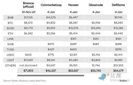 这个故事也可能是关于缺乏对加密钱包内持有的资产进行分类的惯例。加密数据公司尚未就其资产评估中包含的内容达成一致,这一点从对币安在年初可以申报的资产的广泛估计(370 亿至 560 亿美元)中得到证明。系统地对资产进行分类是一项挑战,尤其是当没有标准规定要包括什么以及是否要报告它(扣除交易生成的代币或由它们运营的区块链捆绑资产)。