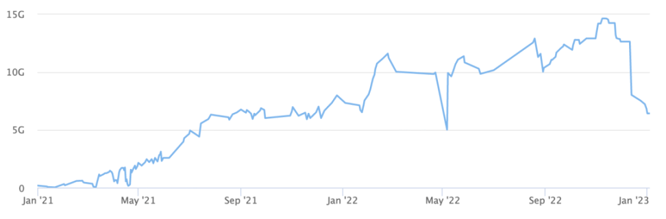 Etherscan 识别出可能属于币安的钱包地址,例如「Binance 8」和「Binance: Binance Peg-Tokens」,它们分别持有所有已发行 BUSD 的 38.1% 和 32.4%。Binance 8 钱包在 2021 年初拥有 1 亿美元的资产,并在 2022 年 11 月中旬增长到高达 150 亿美元,但在过去三周内已经耗尽了近 90 亿美元的 BUSD 代币。
