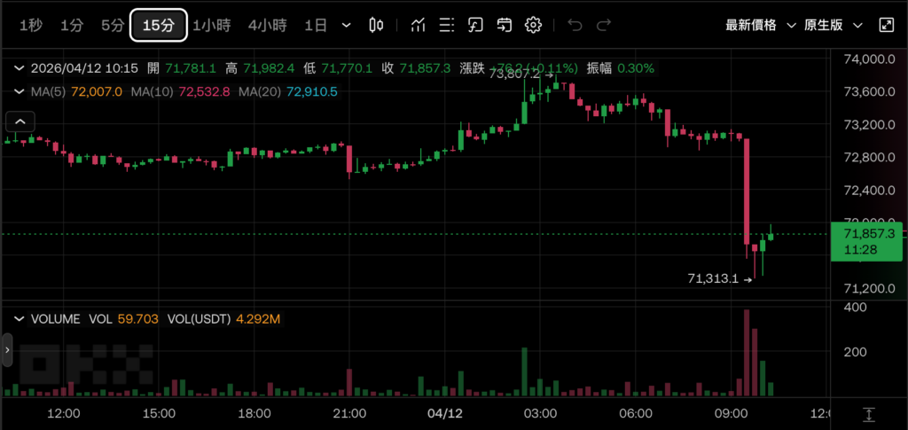 原本比特幣最高觸及 73,800 美元附近,但稍早九點半後隨著談判破局訊息傳出,市場避險情緒預計升溫,比特幣突然快速往下砸一根,最低插針 71,313 美元,現報 71,857 美元。