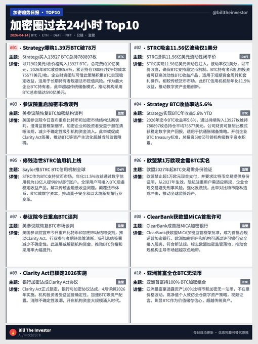 該策略購買了 13,927 個BTC,總持有量為 780,897 個代幣——以每個代幣 71,902 美元的價格購買了 13,927 個BTC 。 過去 24 小時加密貨幣新聞精選,共 10 條👇