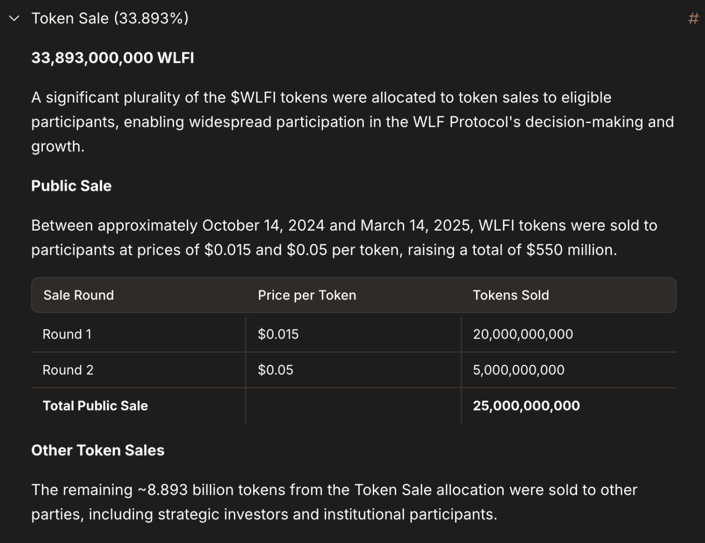 - 除去面向公眾的兩輪銷售外,根據 WLFI 的官方代幣經濟模型,該項目還曾面向戰略投資者和機構參與者合計預售了 88.93 億枚代幣(佔供應量的 8.893%),價格為 0.1 美元/枚。