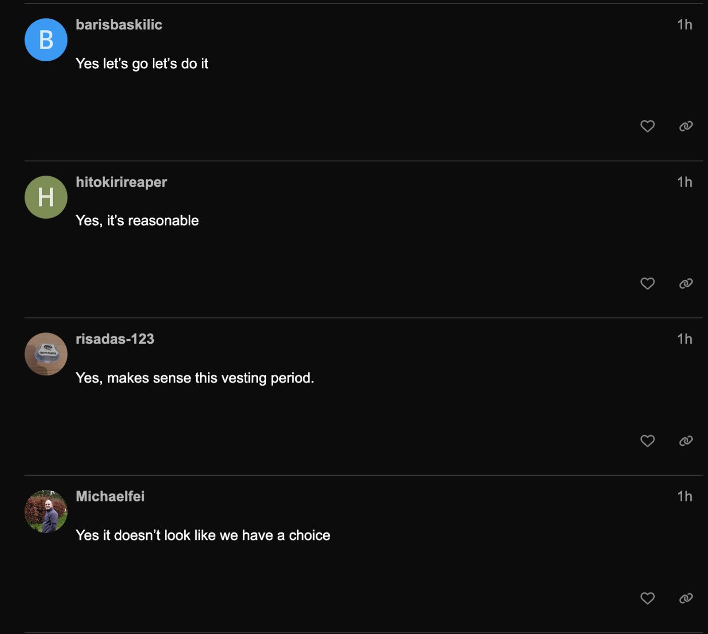 可能是料到了社區會出現較強烈的牴觸情緒,WLFI 甚至在官方治理論壇下邊進行了控評。如下圖所示,只要隨便翻一翻,你就能看到大量格式高度統一的疑似水軍回覆(都用 YES 開頭)。