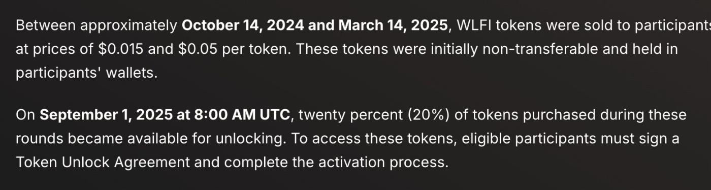 2025 年 9 月 1 月,WLFI 正式上線,預售參與者也迎來了首次解鎖 —— 參與了兩輪公眾預售的用戶,在簽署代幣解鎖協議並完成激活流程後可解鎖 20% 的代幣,剩餘 80% 的解鎖需等待後續治理情況。機構投資者的份額暫未解鎖。