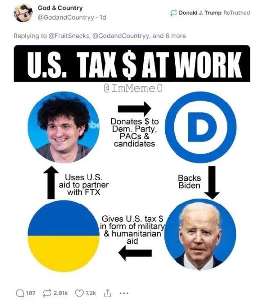 讓人始料未及的是,破產一天之後,FTX 又陷入了另外一個巨大的漩渦之中。保守派網站 Gateway Pundit 於 11 月 12 日發表了一篇報道,稱民主黨將數百億美元轉移到烏克蘭,然後再通過 FTX 的平臺進行洗錢。