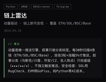 開源了一套“鏈上雷達” 大概能在 18萬美金fdv抓到 $scam 最高也有百倍 適合於兩年前還能熬夜盯鏈的自己 但是現在的我已經盯鏈不了了 開源給大家吧 代碼依然在我的倉庫:http:/connectfarm1.com