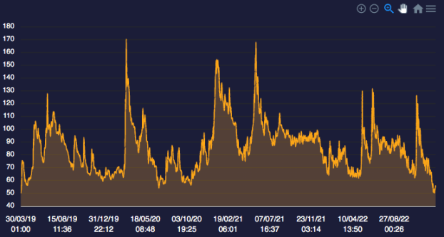 該平臺追蹤比特幣和以太坊的 30 天隱含波動率,範圍在 0 到 200 之間。它使用 Black-Scholes 期權定價模型來計算加密貨幣期權價格的隱含波動率(看跌 / 看漲)。
