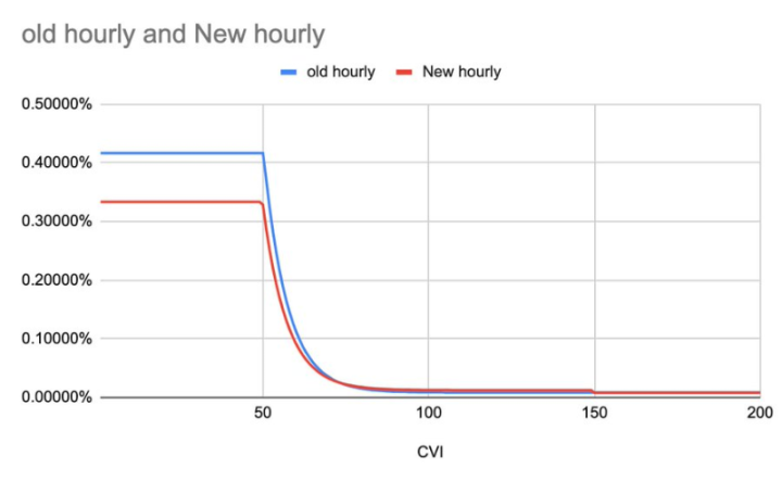 資金費用是根據每小時的 CVI 指數計算的。這意味著,CVI 值越高,費用的百分比越低。這些資金費用由鑄造波動性代幣的交易者支付。