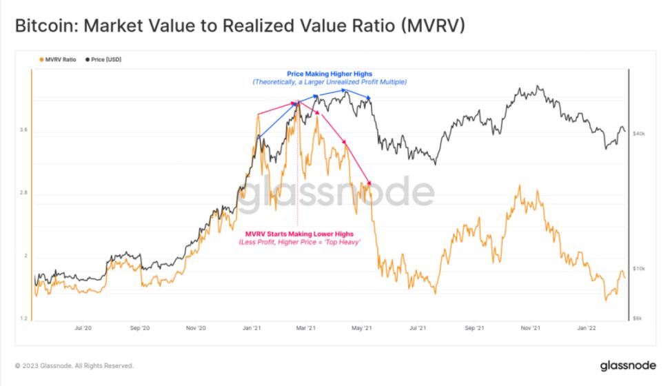 如果我们放大 2021 年 1 月至 5 月的峰值,我们实际上可以看到 MVRV 比率在较小范围内形成了类似的负背离。价格连续创下新高,但 MVRV 迅速下跌至较低的高点。