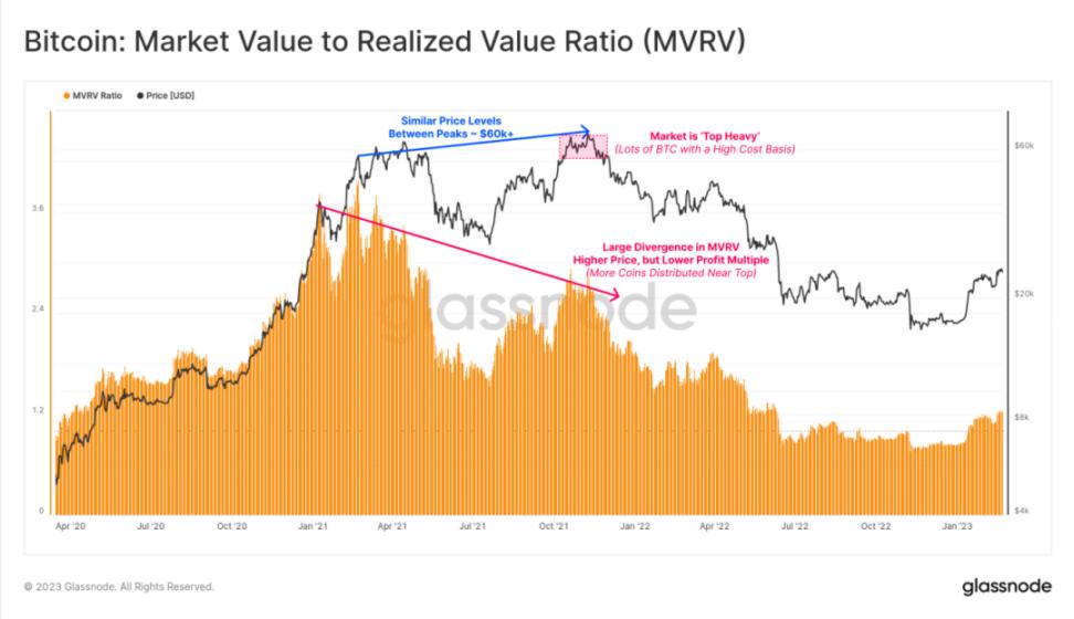 下图显示了整个 2020-23 周期的 MVRV 比率。我们可以清楚地看到与 4 月相比,2021 年 10 月至 11 月的价格如何创造新的历史记录的,但 MVRV 峰值却显著降低。