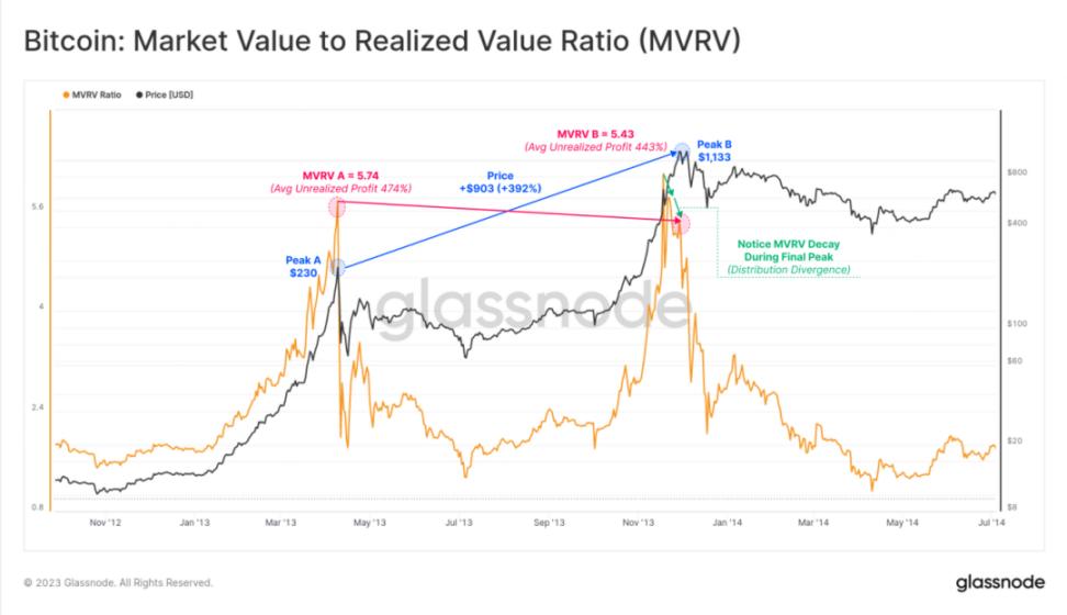 我们可以看到 2013 年发生在两个峰值之间的类似事件,价格上涨了 392%,但 MVRV 比率实际上更低,从 5.74 下降到 5.43。我们可以在下图绿色标记中看到,在最终峰值 1,133 美元之前发生了类似的衰减。