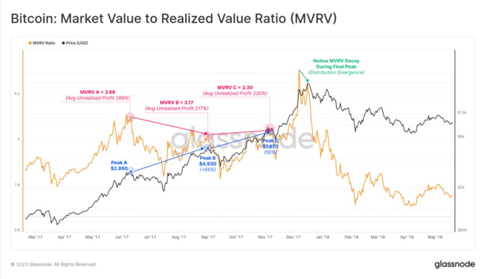 这种情况也出现在 2017 年后期的牛市周期中。随着 MVRV 超过我们定义的极端水平 2.4,我们开始看到更高的价格峰值,但 MVRV 比率的增长逐渐减弱。