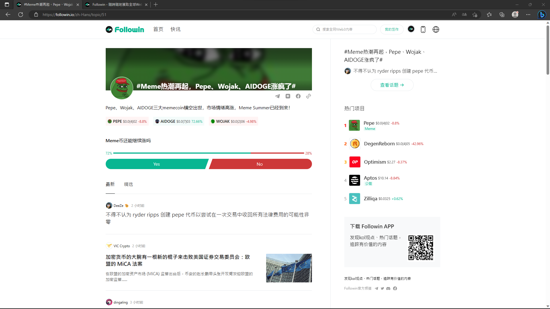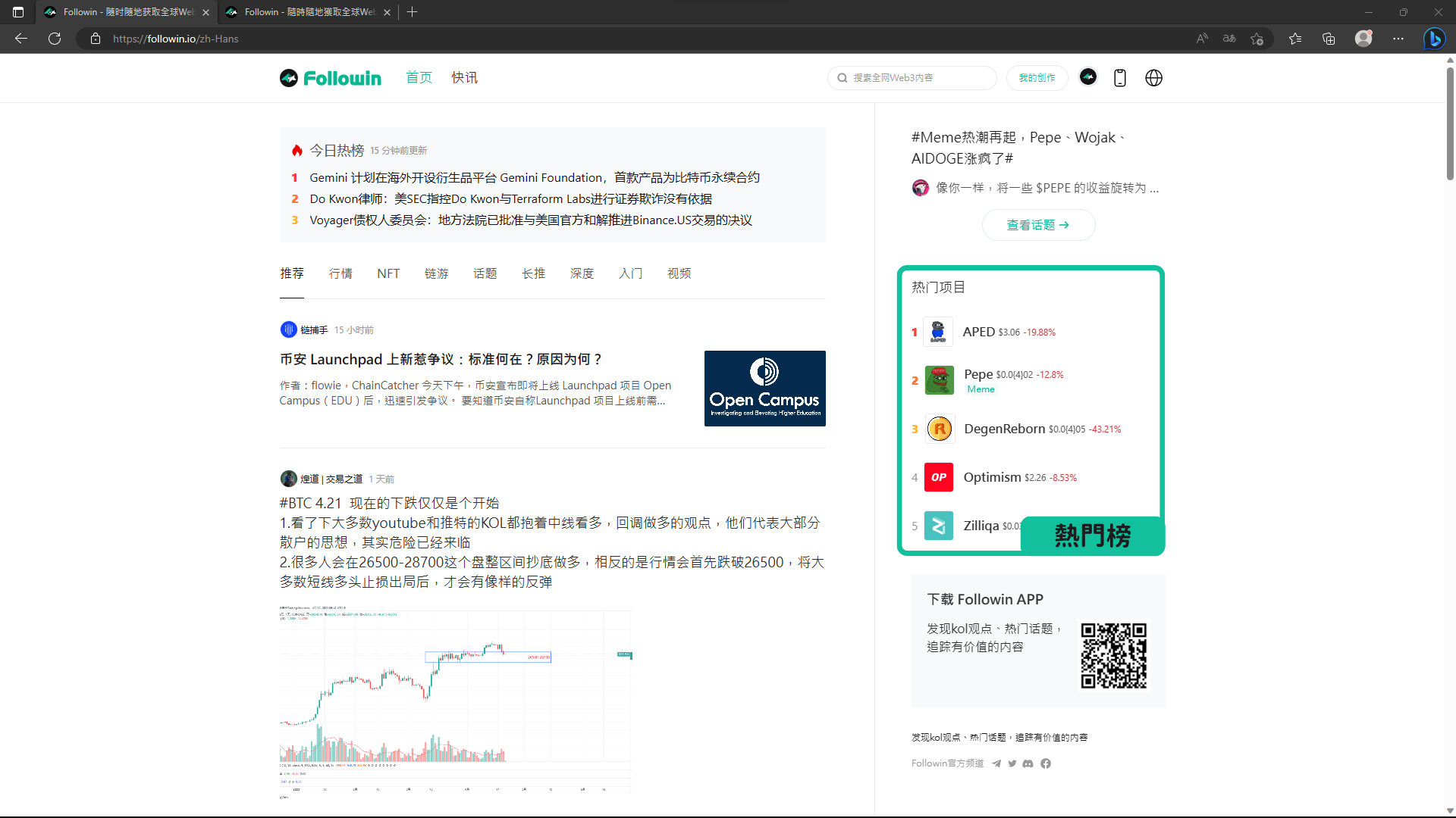 在 Followin 中,可以發現目前幣圈的熱門項目,這個排行是根據國內外各大社群、媒體討論度,進行 AI 算法後得出的熱度排名 !