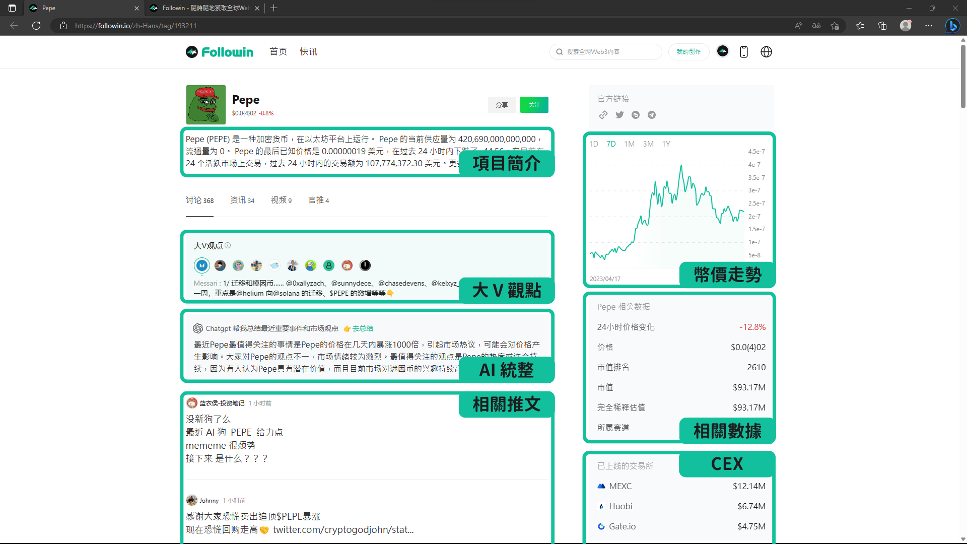 點擊即可到該項目的主頁,在這裡你可以看到自動聚合了與這隻幣相關的資訊,如 : 簡介、大V觀點、官方連結、相關走勢,近期我們更接入了 ChatGPT , 可以使用 Ai 自動幫你整理目前這個幣種的懶人包 !