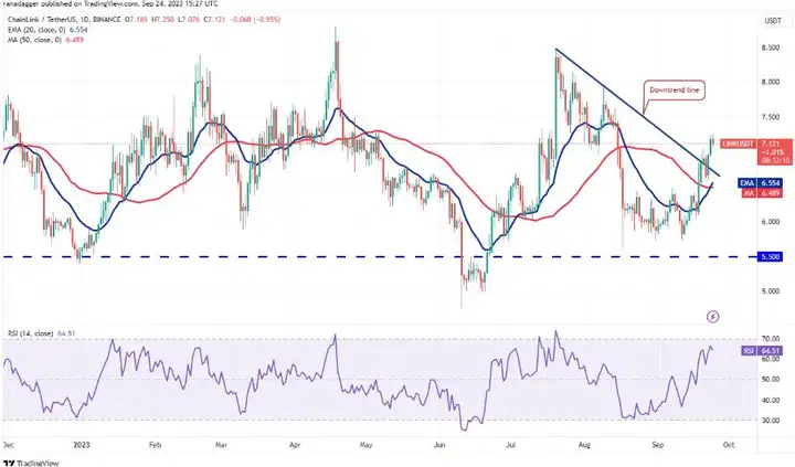 Chainlink(LINK)在美國時間9 月22 日突破了下降趨勢線,這代表近期的走勢可能會改變。從技術面來看,LINK 的日線兩大均線:20 日指數移動平均線EMA、50日MA 已經走出了「黃金交叉」,相對強弱指數RSI 也處於買入區域,代表多頭仍佔上風。