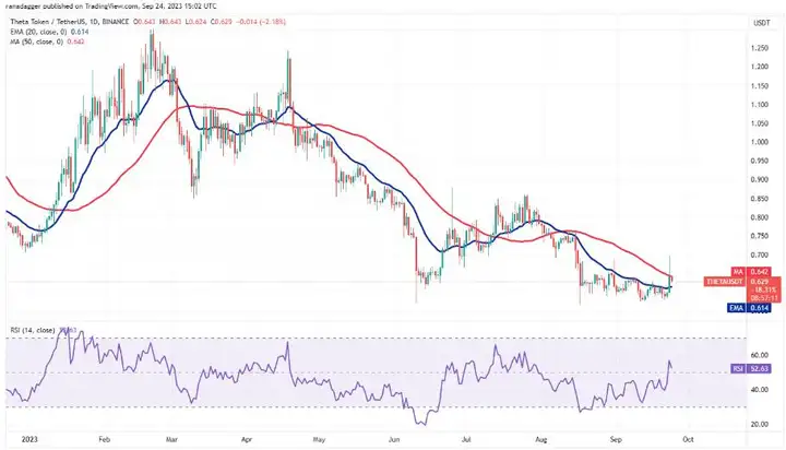 美國時間9 月23 日,Theta Token($THETA)曾突破20 日EMA 點位,並一度漲至0.7 美元,目前則回落至50 日MA 下方(0.642 美元附近)。若$THETA 能反彈突破50 日MA,則將有望重新挑戰0.7 美元。