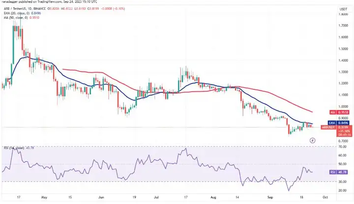 Upadhyay 指出,雖然Arbitrum($ARB)目前處於下跌趨勢,但似乎並未回落太多。目前日線上的RSI 已經升至40 以上,顯示市場動能逐漸轉正,若能進一步突破20 日EMA 上方,則可能會挑戰50 日MA(0.95 美元附近),並有望漲至1.04 美元;若持續下跌,下方兩個值得關注的支撐位為:0.8、0.78 美元。