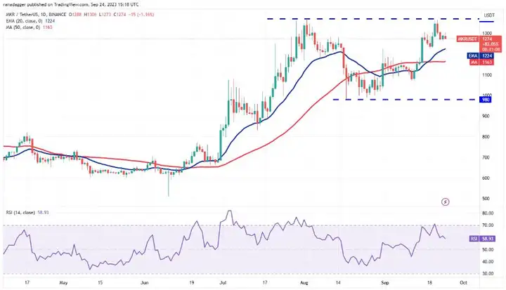 Upadhyay 指出,Maker(MKR)近日曾上漲至1,370 美元並回落,下方可關注20 日EMA 點位,即1,226 美元附近。若能從20 日EMA 處反彈,將有望飆升至1,759 美元阻力;但如果跌破20 日EMA,可能會讓幣價回落至980-1,370 美元區間震盪。