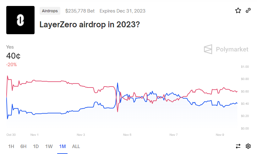 自10月底以來, Polymarket上2023年LayerZero空投的幾率翻了一番。 ARB空投前幾周也發生了同樣的事情。