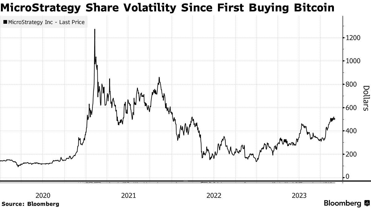 自首次購買比特幣以來,MicroStrategy 股價波動;來源:彭博社