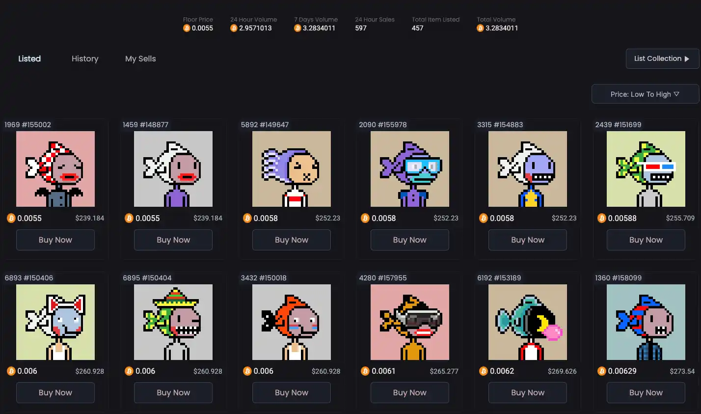 FISHFACEMAN 是 12 月 23 日開啟 Dmint 的 NFT 項目,總量一萬個,鑄造的 GAS 成本價約為 50U,在上線 Atomical Market 交易市場後,最高漲至 300U,是目前的龍二項目。