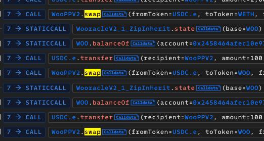 攻擊者利用300,000 USDC.e,在 WOOFi 的交換功能中執行了多次交換操作。將WOO價格從56,884,100上調至60,400,479 。