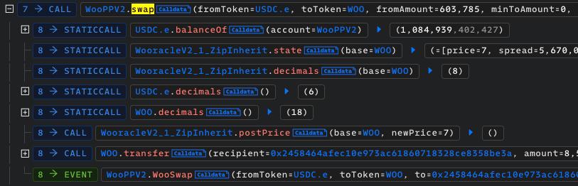 實際攻擊發生在攻擊者將8,196,117 WOO 換回USDC時。這導致 WOO 的價格下跌,達到0.00000007 ,跌幅為 862 萬倍。