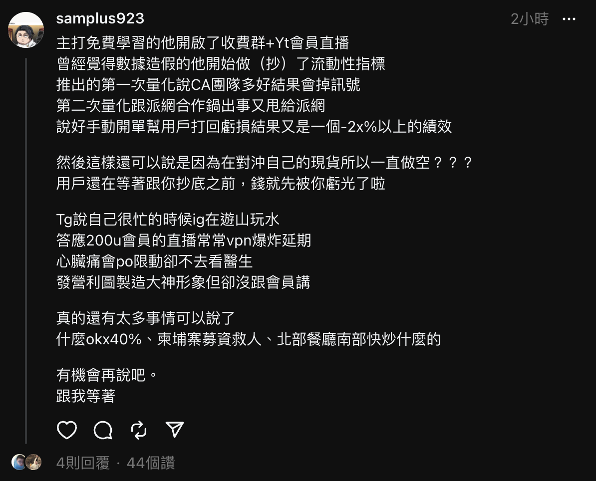 沒想到,該則貼文的用字引來了誤會,不少 KOL 認為 Alex 是將所有成員跟單資金拿來「對沖自身現貨」下跌風險,紛紛展開評論與爭辯。台灣交易團隊 DA Capital Alpha 分析師 Samplus 在 Thread 上首先開砲,貼文中先以「啟蒙老師」敬稱 Alex ,然而一字一句中卻透露出相當濃厚的火藥味與不滿。