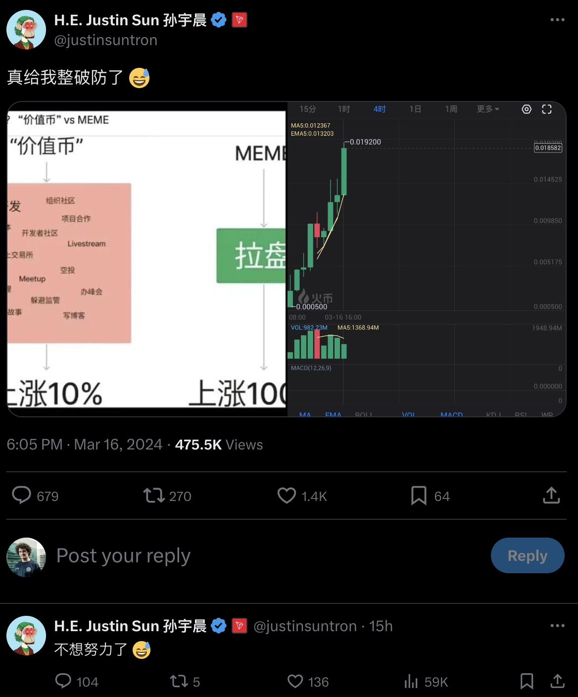 另一方面,看到 Solana 生態迷因幣 $BOME 在短短三天內接連暴漲下,孫哥也在 X 平台分享自己的看法,他秀出「價值幣」與「迷因幣」的比較圖,相較於迷因幣,價值幣需要開發、項目合作、躲避監管……等各種努力,才能讓價格有些微上漲,然而,在迷因幣僅僅需要「拉盤」。