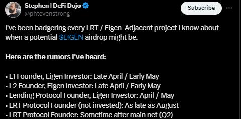 許多 AVS 項目可能會為 Eigenlayer 用戶進行空投,就像 Altlayer 幾個月前推出其代幣時所做的那樣。
