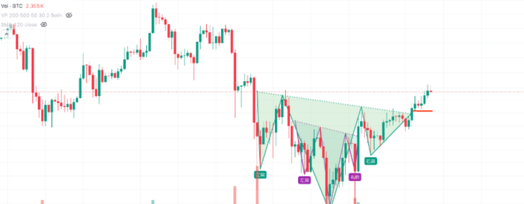 從技術面上看BTC的4h級別K線,有一個複合頭肩底的走勢,綠色是一個大的頭肩底,目前已經突破頸線。而綠色頭肩底的頭部又是由一個小型頭肩底所構成。結合技術4h級別的技術指標看漲,以及突破時的成交量有所放大,這個頭肩底應當可以判定是有效成立的。下圖紅線處也可以看到,BTC在突破6.55w以後還有一個橫盤迴踩確認的過程。