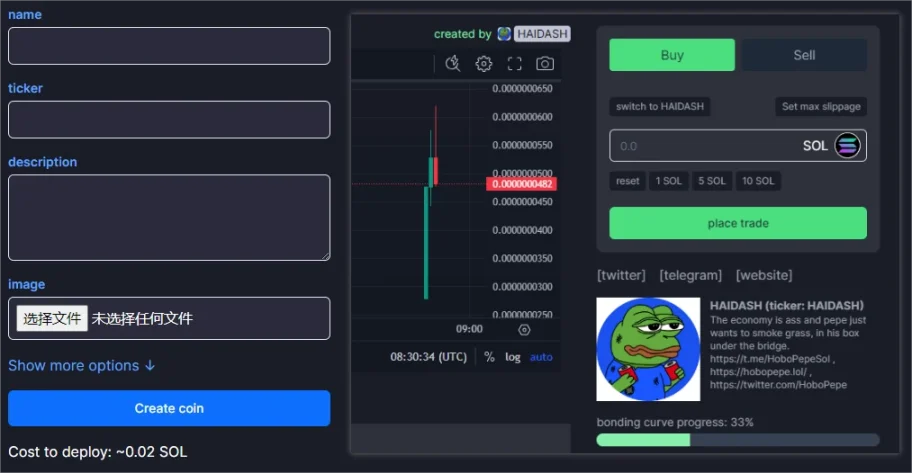 - 創建代幣:發幣者只需輸入代幣的名稱、代幣描述和配圖,並支付約 0.02 SOL,即可開啟一個代幣的「募資」發行流程。