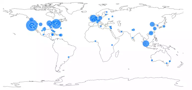 但當我們把目光放到城市上時,這個現象會更加明顯。根據 Crypto Fund Research 資料,舊金山和紐約擁有世界上最多的加密基金 (>70 家),而倫敦、新加坡和香港以 30-50 家加密基金的數量位居其後,芝加哥、上海、洛杉磯、瑞士楚格、加州門羅帕克和聖莫妮卡則處於 10-20 家加密基金的第三陣營。在地圖上也能清楚地看到,加密基金在美國東西部沿海和西歐較為集中,部分位於東亞和東南亞,其他則分佈在東歐、西亞和澳洲,而非洲與南美只有零星幾家。