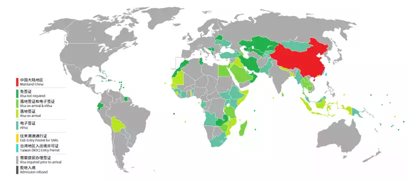 首先由於中國護照的特殊性,我們根據維基百科資料找到了下面這張圖,它將為持中國普通護照的公民可以獲得的簽證分為了:1. 免簽證;2. 落地簽證和電子簽證;3. 落地簽證;4. 電子簽證;5. 往來港澳通行證;6. 臺灣地區入初許可證;7. 需要提前辦理簽證;8. 拒絕入境。同時根據不同地區的情況,將其標上了對應的顏色。從圖上可以直觀地看到中國護照相對便捷的區域主要分佈在東南亞、中東、東歐、東非和部分南美洲。對中國公民實施免籤、落地籤的國家或地區的詳情可以參考中國移民管理局 2019 年釋出的《45 個國家或者地區對中國公民實施免籤、落地簽證政策》。