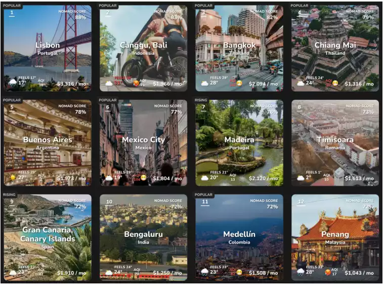 Nomadlist 綜合考慮生活成本、氣候環境、娛樂性、網路質量等給出了一個 nNomad Score,從高到低的前 12 個城市如下,其中東南亞和歐洲南部國家各佔據 4 席。這 12 個城市的生活成本從 1000 美元每月到 3300 美元每月不等,平均約為 1800 美元每月。儘管里斯本是 12 個城市中綜合得分最高的,但是其生活成本也是最高,遠超生活成本第二高的馬德里 1000 美元。反而是清邁以 1316 美元每月的生活成本奪得第四的排名顯得十分具有吸引力。