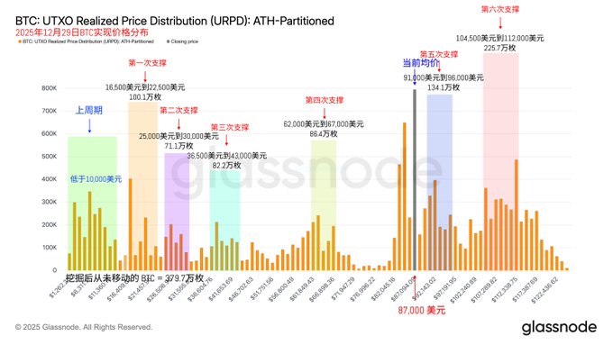回到 Bitcoin 的數據來看,換手率在週日進一步降低,這也是預期中的數據,投資者在假日的時候情緒還是非常放鬆的,最近很長一段時間 $BTC 的價格都在 88,000 美元震盪了,尤其是 87,000 美元的存量快接近80萬枚了,這不是一個好的信號,每當單一價格的存量太多的時候就會迫使投資者選擇方向。