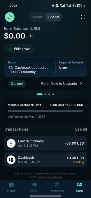 比http:/ether.fi更強的U卡出現了 http:/jupiter.global 返現4%,每月上限2500u. 亞太區的用戶在非美元交易時有1.8%的貨轉。非亞太用戶有1%貨轉。 ATM提款也沒有費用 用我的referral在激活卡片之內30天如果消費1000u以上可以額外返現200u. 我的referral: AYYVX6GC