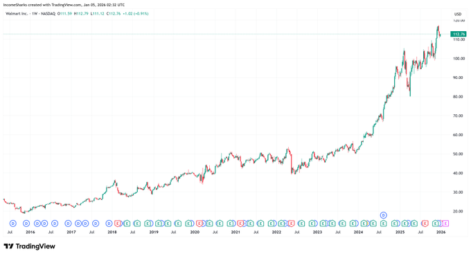 $WMT - 一些走勢圖最漂亮的股票,交易起來卻往往是最無聊的。沃爾瑪已經連續十年保持著令人矚目的成長動能。