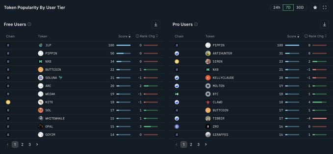 本週,有三種代幣同時受到免費用戶和付費用戶的關注: $PIPPIN、$NX8 及 $BUTTCOIN