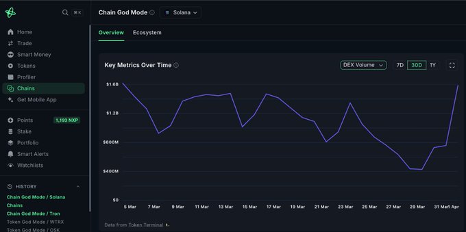 .@ Solana DEX 交易量在 4 月 1 日達到 15.9 億美元,24 小時內增長了 111%。 圖表顯示,3 月下旬交易量一度跌至約 4 億美元,之後迅速反彈。 Solana上的兩種代幣在此次上漲中表現突出👇