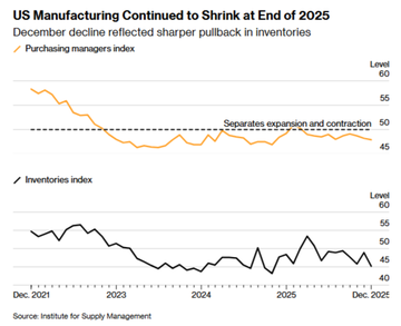 「美國製造業活動在12月份出現自2024年以來最大幅度的萎縮,為美國工廠艱難的一年畫上了句號。」bloomberg.com/news/articles/20...… “12月份,包括服裝、木製品和紡織品在內的15個行業出現萎縮。僅有兩個行業實現了增長。”