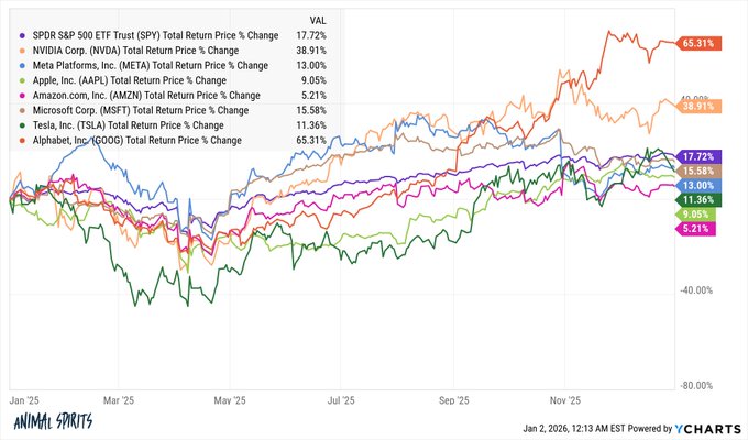 2025 年收益預測: Google +65% 英偉達 +39% 標普500指數 +18% 微軟 +16% META +13% 特斯拉 +11% 蘋果 +9% 亞馬遜 +5% 去年,七大科技巨頭中只有兩家跑贏大盤 還有一些其他令人意外的發現: awealthofcommonsense.com/2026/...…