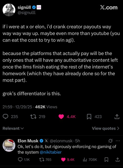 埃隆表示,X平臺上的創作者將獲得更高的報酬。 我們一直以來都這麼說——但我堅信,這對於整個平臺的可持續發展而言,才是正確的道路。 頂尖人才會追求更高的激勵,而更優質的創作者會吸引更多的觀眾。