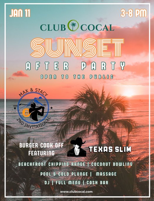 我們的@MaxAndStacyGolf 賽後派對有一些改變! @modernTman 也會來參加我們的漢堡烹飪大賽! 在派對之前,我們也會在@btcfarmersmrkt 的海灘上舉辦活動!更多資訊即將發布。 這將會是精彩的一天!