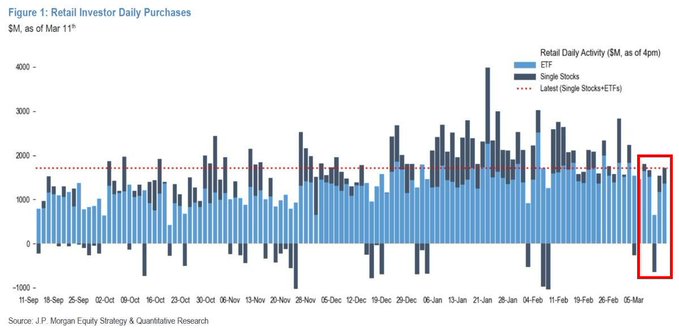摩根大通資金流動報告: 散戶投資者持續疲軟跡象 - 投資者已“暫停”買入,每週買入量下降30%,ETF資金流入下降22%。 - “今年以來,散戶投資者首次出現持續疲軟的跡象。”