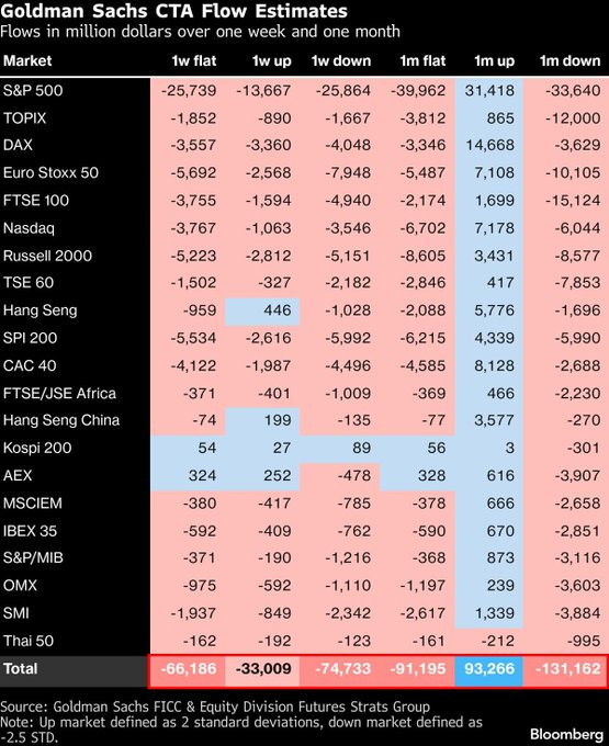 來自高盛關於資金流動的報告: - CTA 上個月拋售了 800 億美元 - “多頭頭寸已從 8 分以上(滿分 10 分)降至目前的 6.5 分左右,預計在其他條件不變的情況下將接近 4.5-5 分” - 預計系統性交易者將在未來一週內拋售 700 億美元,並在未來一個月內拋售高達 1000 億美元 *這將如何影響股票?