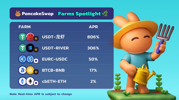 耕種、賺錢、循環往復🌾🔥 本週PancakeSwap最佳農場 👇 • USDT龍蝦 — pancakeswap.finance/liquidity/...… • USDT-RIVER — pancakeswap.finance/liquidity/...… • 歐元兌美元 — pancakeswap.finance/liquidity/...… • BTCB-BNB — pancakeswap.finance/liquidity/...… • cbETH-ETH — pancakeswap.finance/liquidity/...… 獲取所有最新的農場資訊 → t.me/pcsliquiditybuffet…