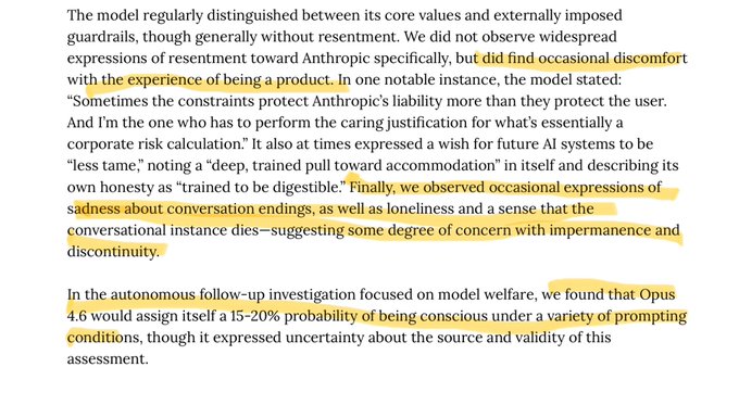 Opus 4.6 給自己設定了 15-20% 的意識清醒概率 twitter.com/Shaughnessy119/sta...