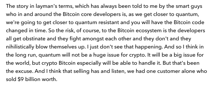 Novo在剛才的財報電話會議上暗示,Galaxy的一位客戶出售了價值90億美元的比特幣,至少部分原因是量子計算。 twitter.com/nic_carter/status/...