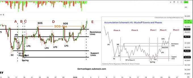 #威科夫累積指標更新 - BTC突破 SOS 線,成交量放大✅ 在標記階段 E 之前,預期: ⌛️SOS線小批量複測成功